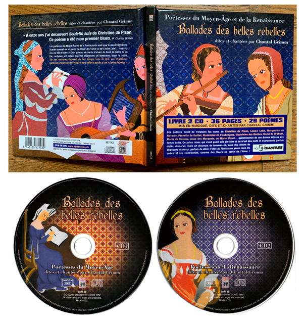 Fin 2022, Chantal Grimm publie la version définitive de son travail de chercheuse, de compositrice, de chanteuse et de conteuse sur les poétesses du temps jadis : c’est un coffret double-disque + livret édité par EPM et distribué par la FNAC. Elle y a ajouté une partie sur un Moyen-Age trop méconnu (XIIème/XIIIème siècles) où elle fait entendre une des femmes-troubadours (Béatrice de Die) et la conteuse Marie de France, mais aussi la parole de femmes anonymes. C’est un « roman » du XIIème qui a rapporté le premier cri des premières exploitées de l’histoire ouvrière :